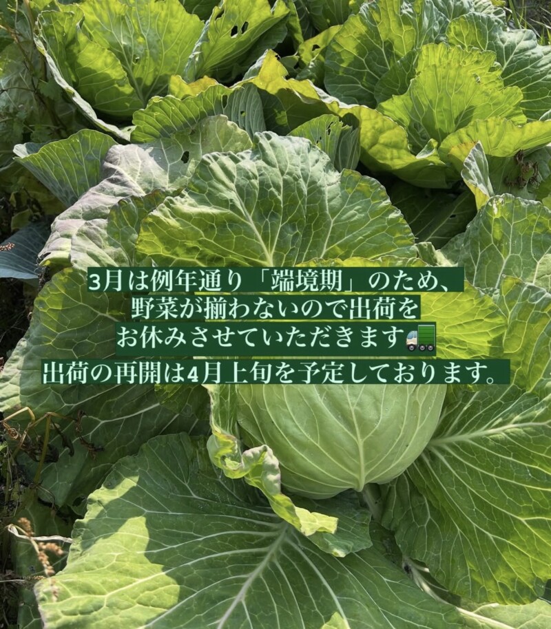 さて、3月は例年通り「端境期」のため、野菜が揃わないので出荷をお休みさせていただきます🚛出荷の再開は4月上旬を予定しております。